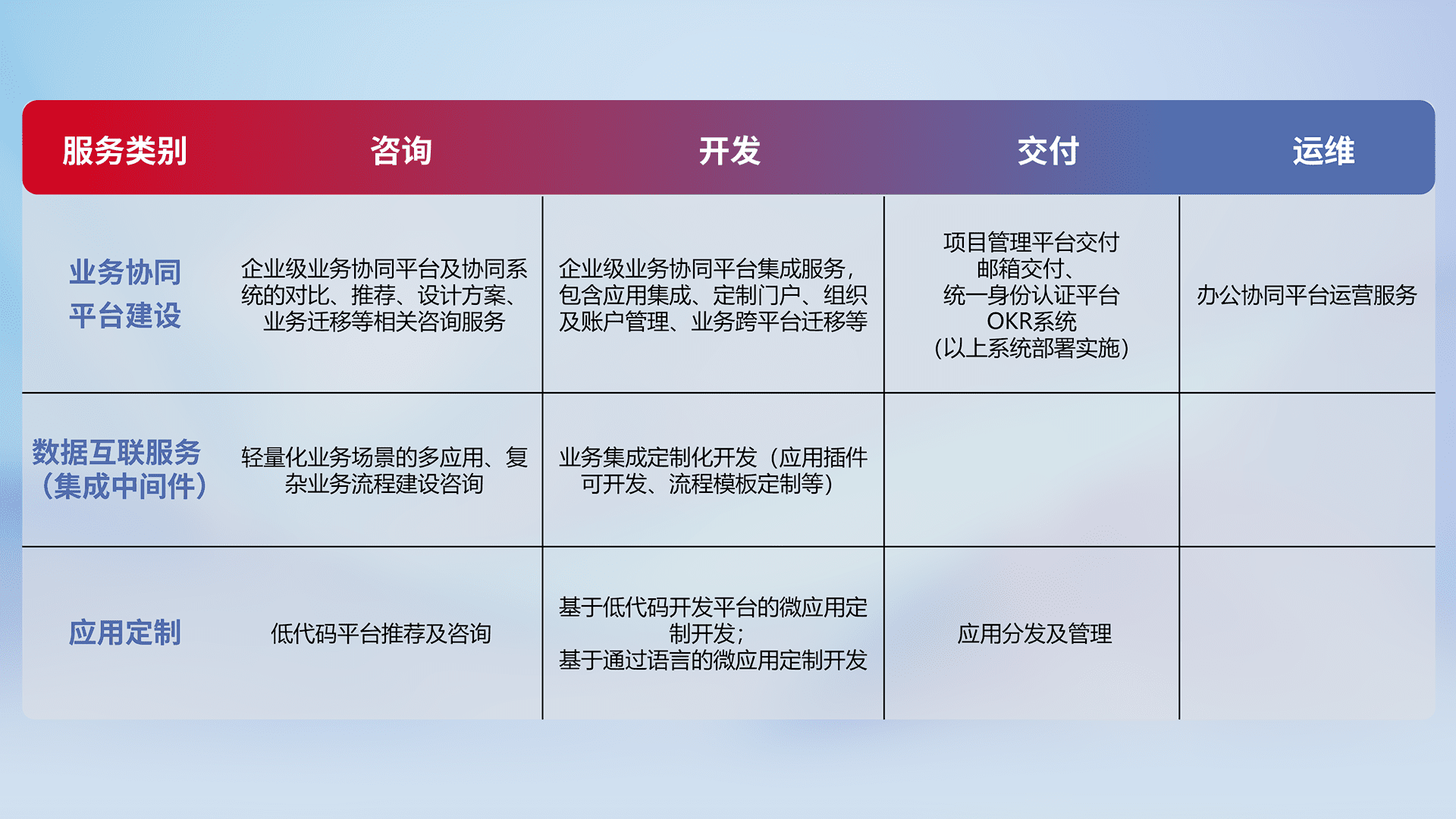 针对钉钉、、企微、、、、IDaas等平台级产品提供产品的规划、、、方案、、、交付、、定制化开发等服务,,,实现如统一协同办公、、智能客户服务、、、、混合会议管理、、、智能数据查询、、、等业务场景,,实现数字化转型。。。。