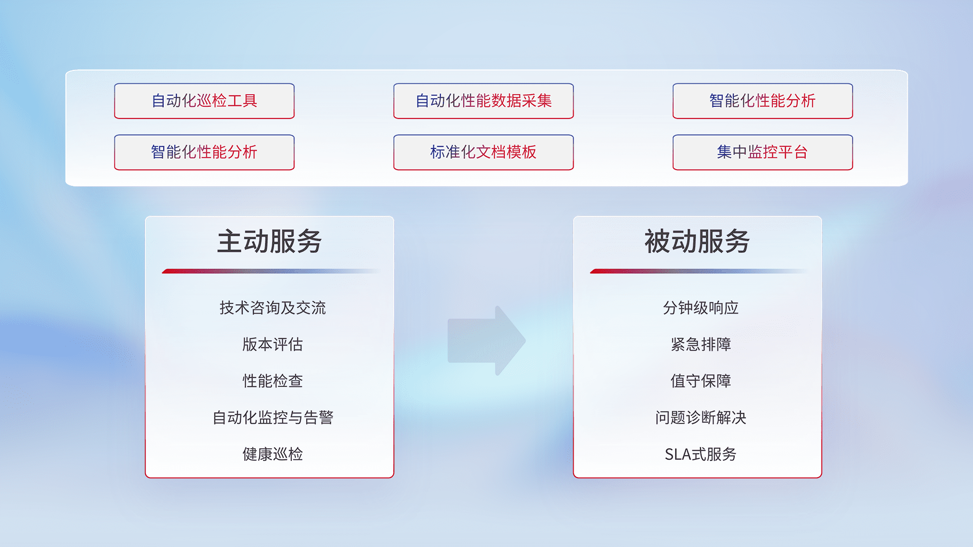智能化工具和标准化文档,,保障服务质量,,,,提供主动服务(包含技术咨询、、版本评估、、、、性能检查、、、、自动化监控与告警、、、健康巡检)和被动服务包含(分钟级响应、、紧急排障、、、值守保障、、问题诊断解决、、、、SLA服务)。。